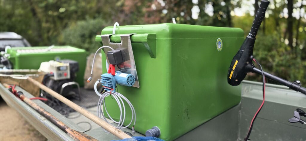 Der Aufbau des neuen Transportanhängers besteht aus 3 separaten Transportbehältern mit je 800 Liter Fassungsvermögen. Die Sauerstoffversorgung ist fest auf dem Anhänger integriert und kann für jeden Behälter individuell geregelt werden. Eine eigene Lichtquelle lässt nun auch Arbeiten bis in die Abendstunden zu.